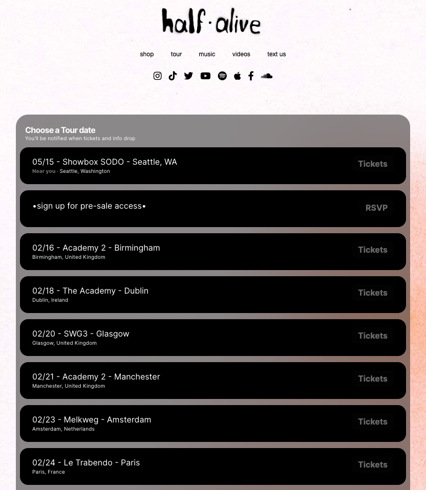 Check out how Half Alive replaced the tour section of their site with a clean and on-brand embed.