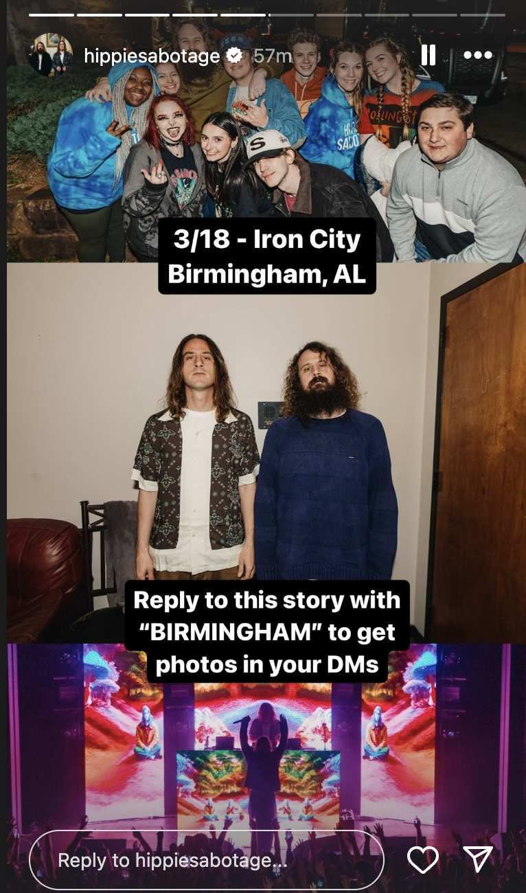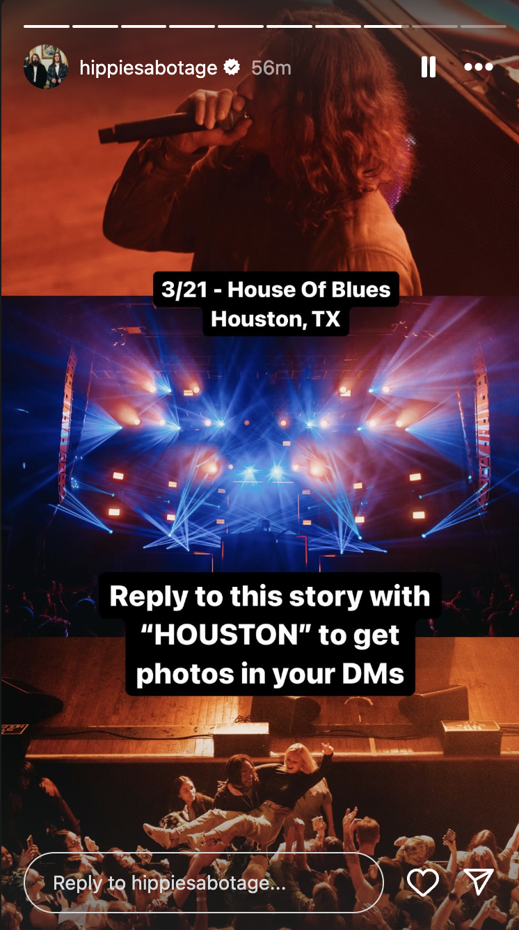 📸 The day after the show, Hippie Sabotage posted Instagram Stories prompting fans to respond with a designated IGDM keyword to unlock an album of photos from the night prior.