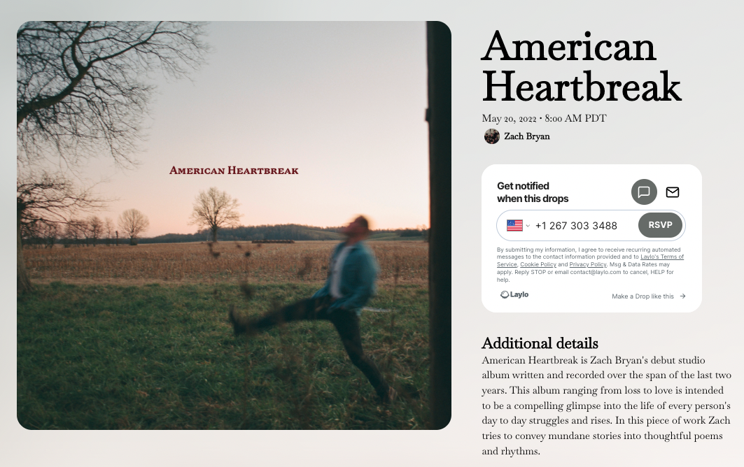 Give yourself time to collect sign ups well before release day. If you’re dropping a single, you should share your Laylo link 1-2 weeks before the drop.