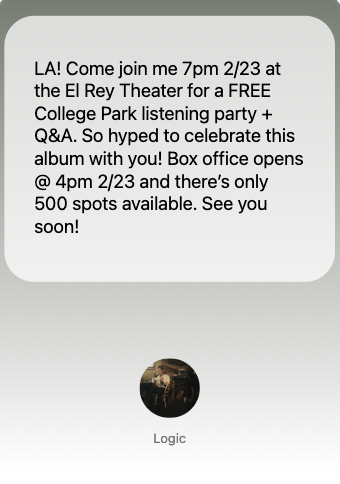 🤝 Logic used Laylo’s location targeting to send a message to people in and around LA about an exclusive album listening party!