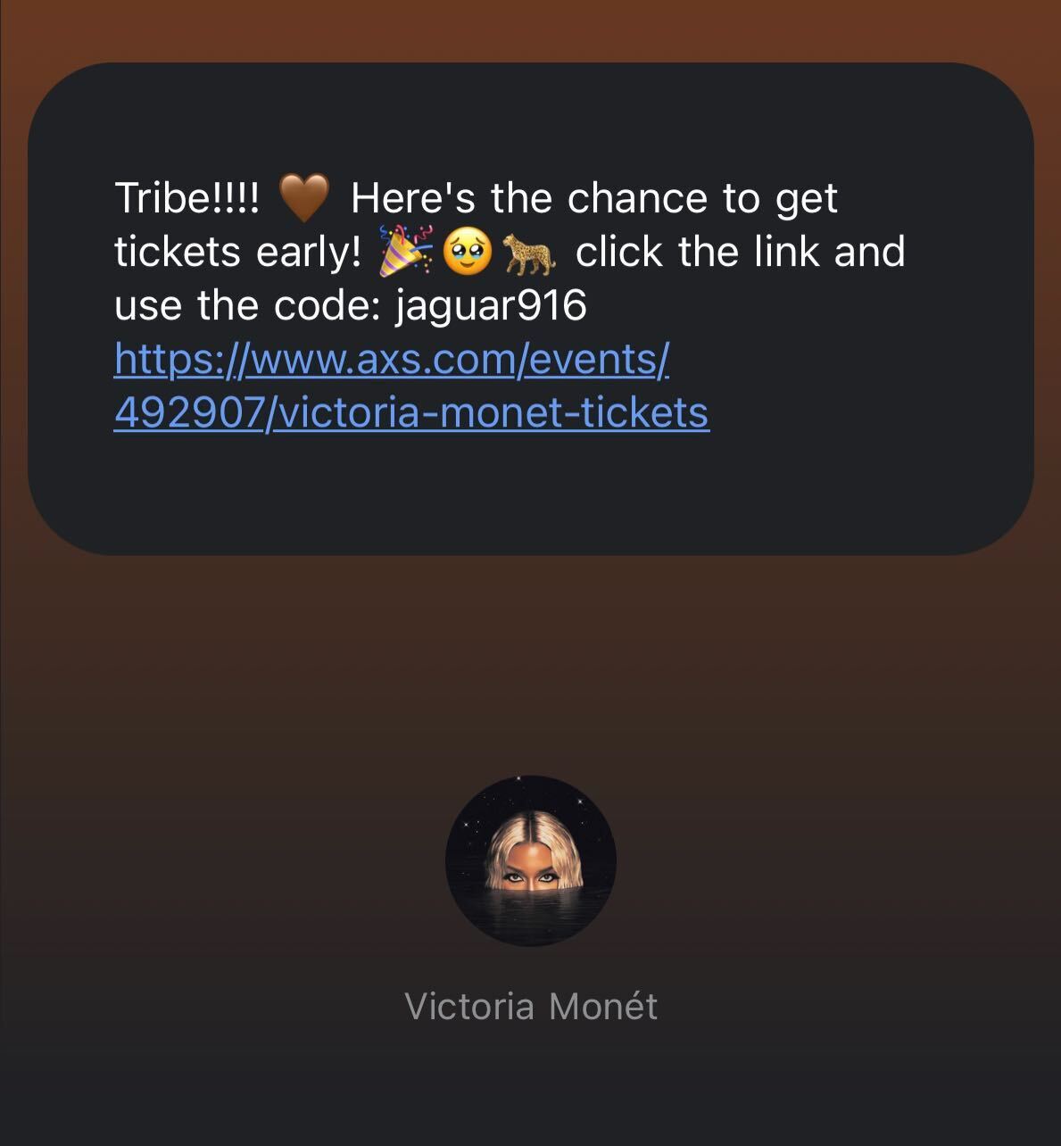 🎫 In July, Victoria created a multidrop to announce her 23 stop tour for JAGUAR II. This first wave of signups drew in thousands of phone numbers and emails with fans segmented by cities.