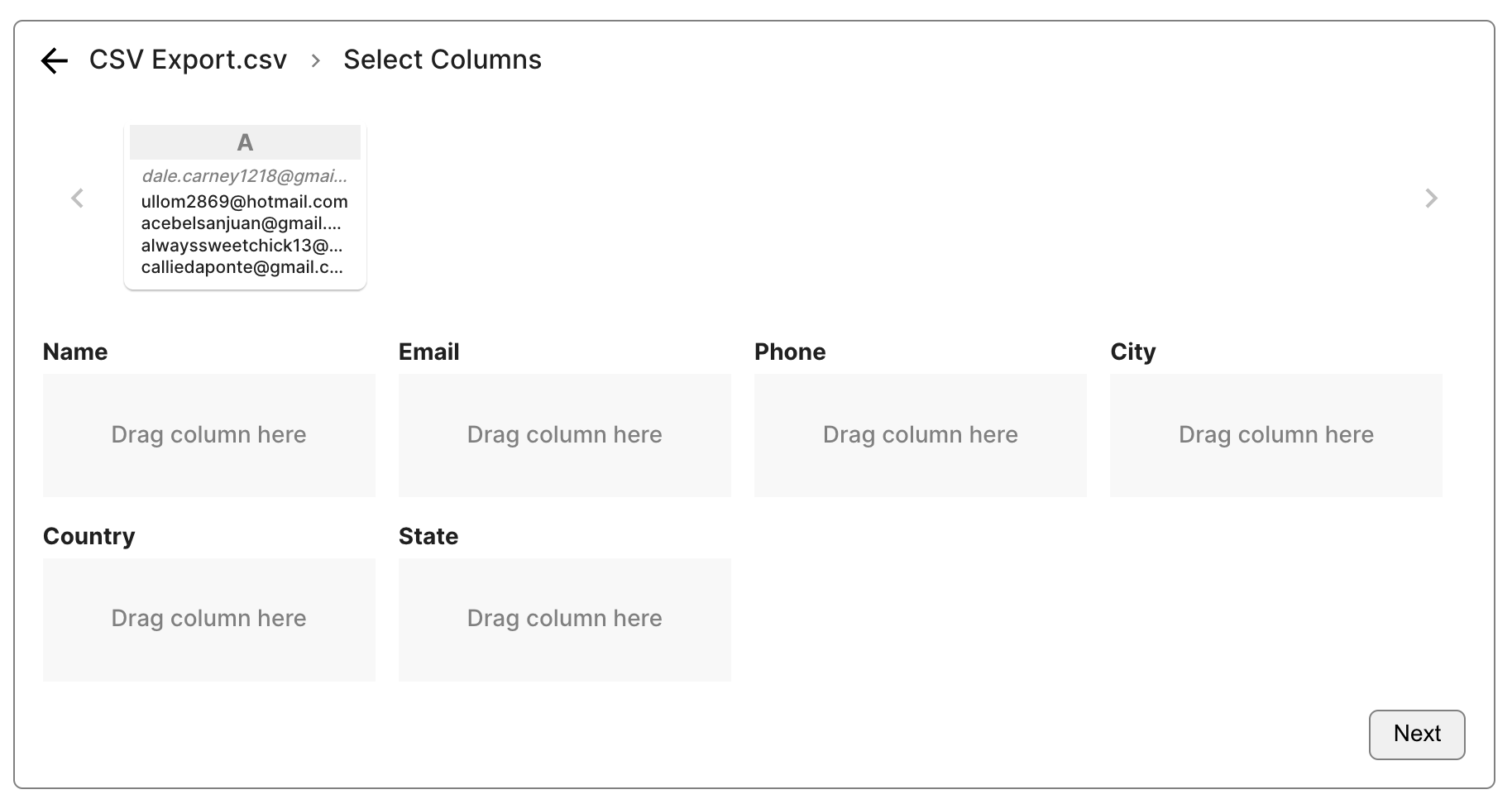 Drag the data into the correct columns. For instance, drag Email Addresses into the Email Column.