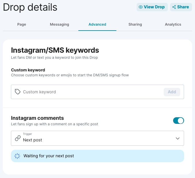 Follow these steps to Create a Drop. Once you’ve set up your drop head to the Advanced Settings where you’ll see a button to turn on Instagram Comments.