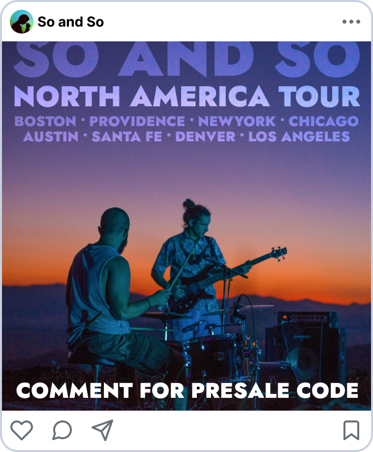 Announcing a tour with Laylo's Multidrop? Just link your multidrop to an Instagram post about the tour. That way, everyone who comments will automatically sign up for your Laylo.