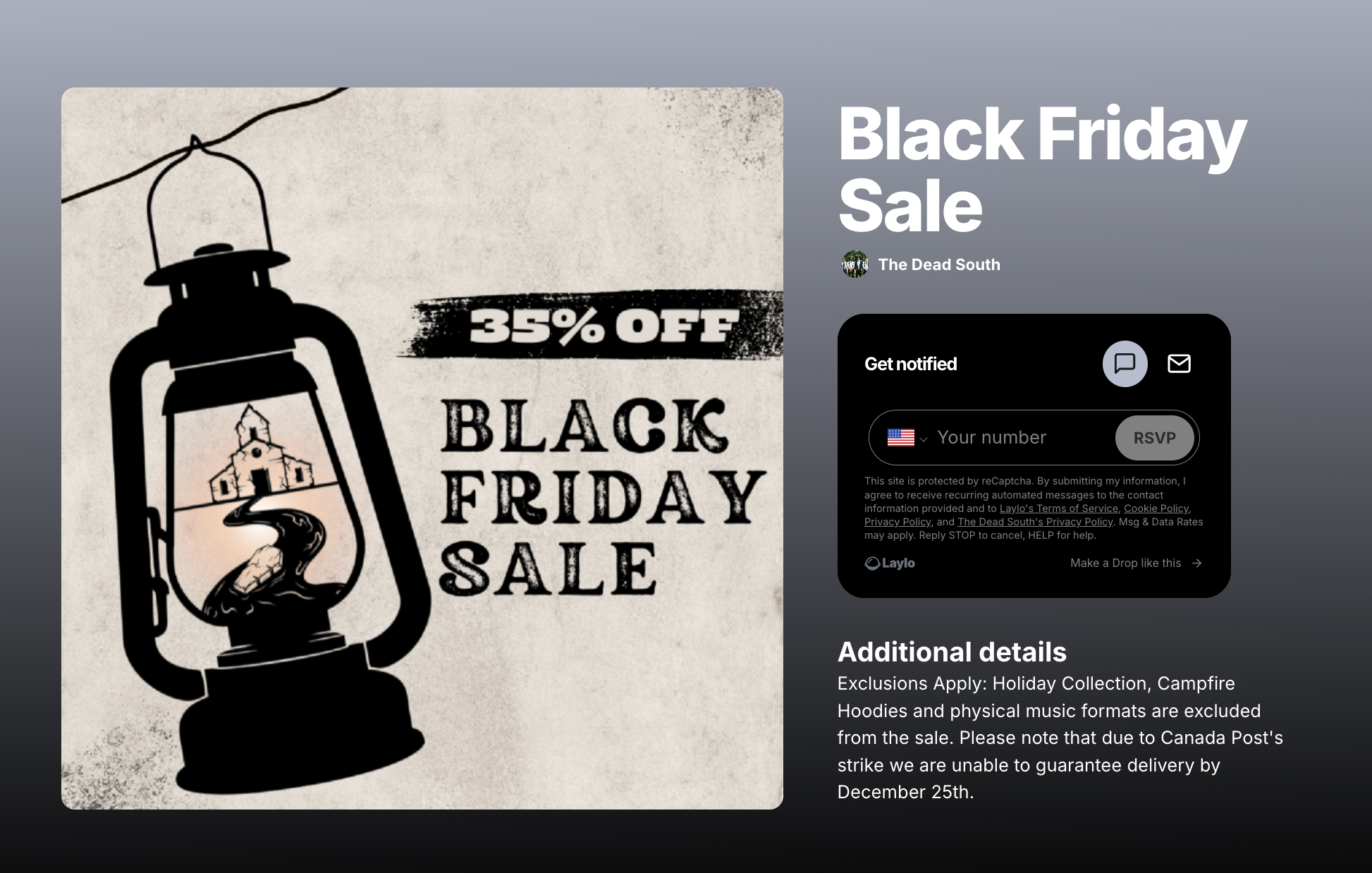 - Nov 28th, am: Black Friday Launch (Social Media + Laylo Drop + Message to Full List)