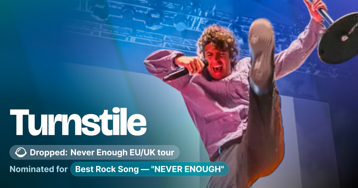Turnstile's Never Enough album and EU/UK tour cemented them as one of rock's most vital live acts. From Glastonbury to a sold-out Alexandra Palace, the band used Laylo to manage presale demand for a 20+ date European run. With support from The Garden and High Vis, the tour became a showcase for punk and hardcore's next generation.