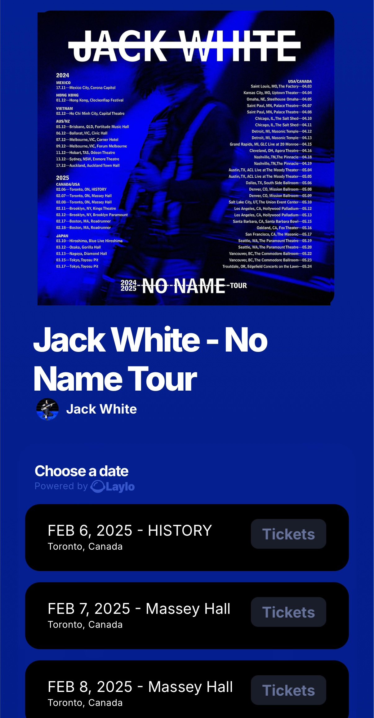 With all the data gathered, Jack White’s team launched a full tour using Laylo’s multidrop feature. Fans were able to sign up for their city, ensuring they received early access to ticket sales and exclusive updates.This approach created a seamless transition from the smaller, intimate shows to the large-scale tour, keeping fans engaged throughout the entire rollout. When tickets were released, Jack posted a video on Instagram announcing that tickets were now available, directing fans to his Laylo link in bio where they could access the multidrop and purchase tickets for their chosen show.