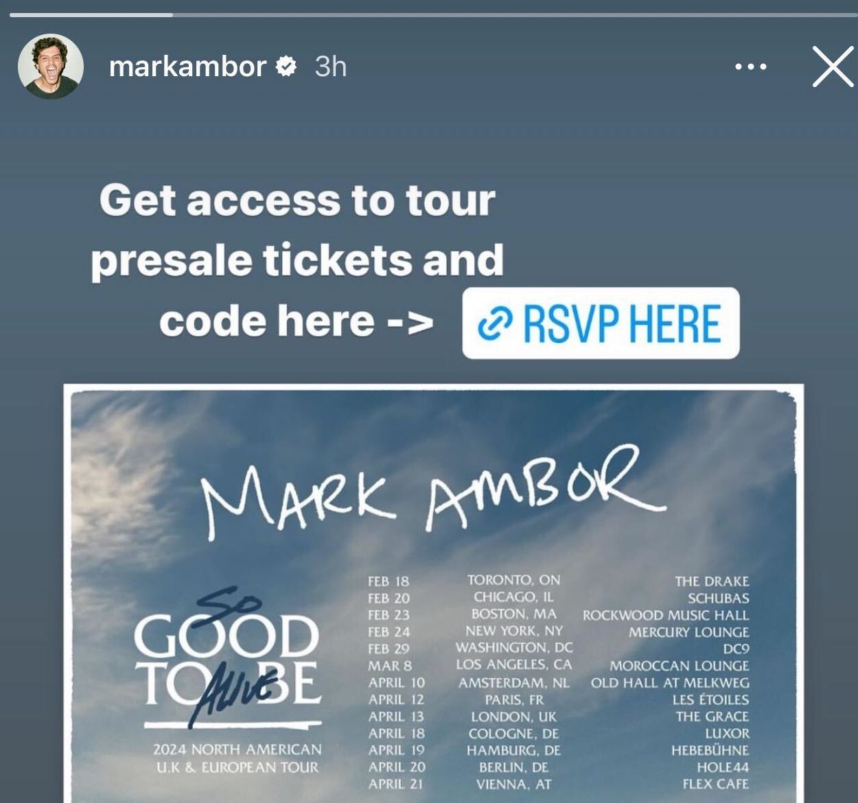 TENS OF THOUSANDS of fans RSVP'd for shows around the globe, begging Mark to come play in their city. The tour was a massive success, with multiple nights added in major marks and tons of momentum for Mark's next move.