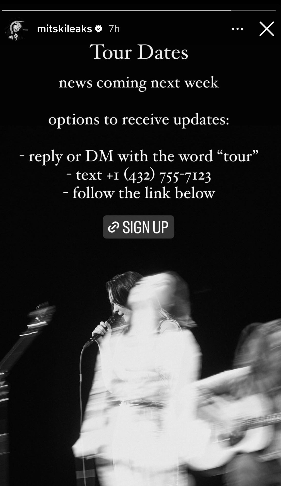 Mitski offered multiple ways to sign up. Fans could send her a text, click the link in her story/bio or send her a DM with “Tour.” Each path automatically set fans up for early updates and funneled them into her drop list on Laylo.