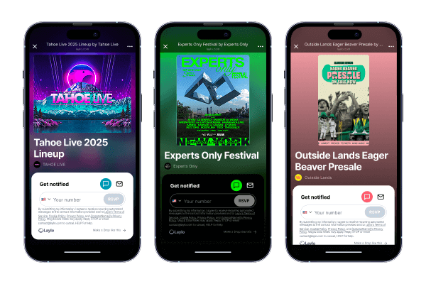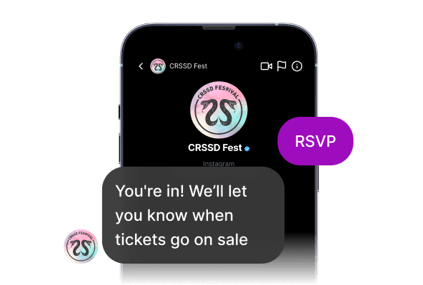 Collect RSVPs for an upcoming drop via email, SMS, and IG. Automatically message fans when tickets go live. Global SMS and compliance across 100+ countries and major carriers.