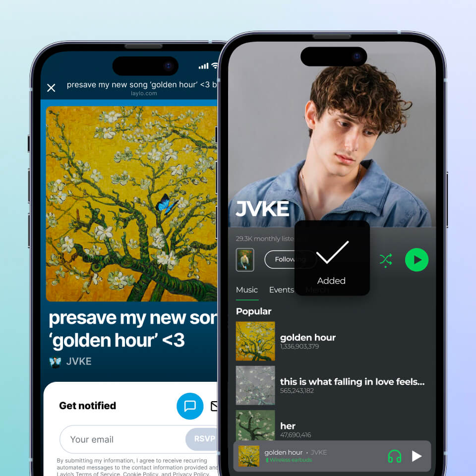 Build landing pages in seconds. Fans sign up in 1-click and get notified when the drop goes live.